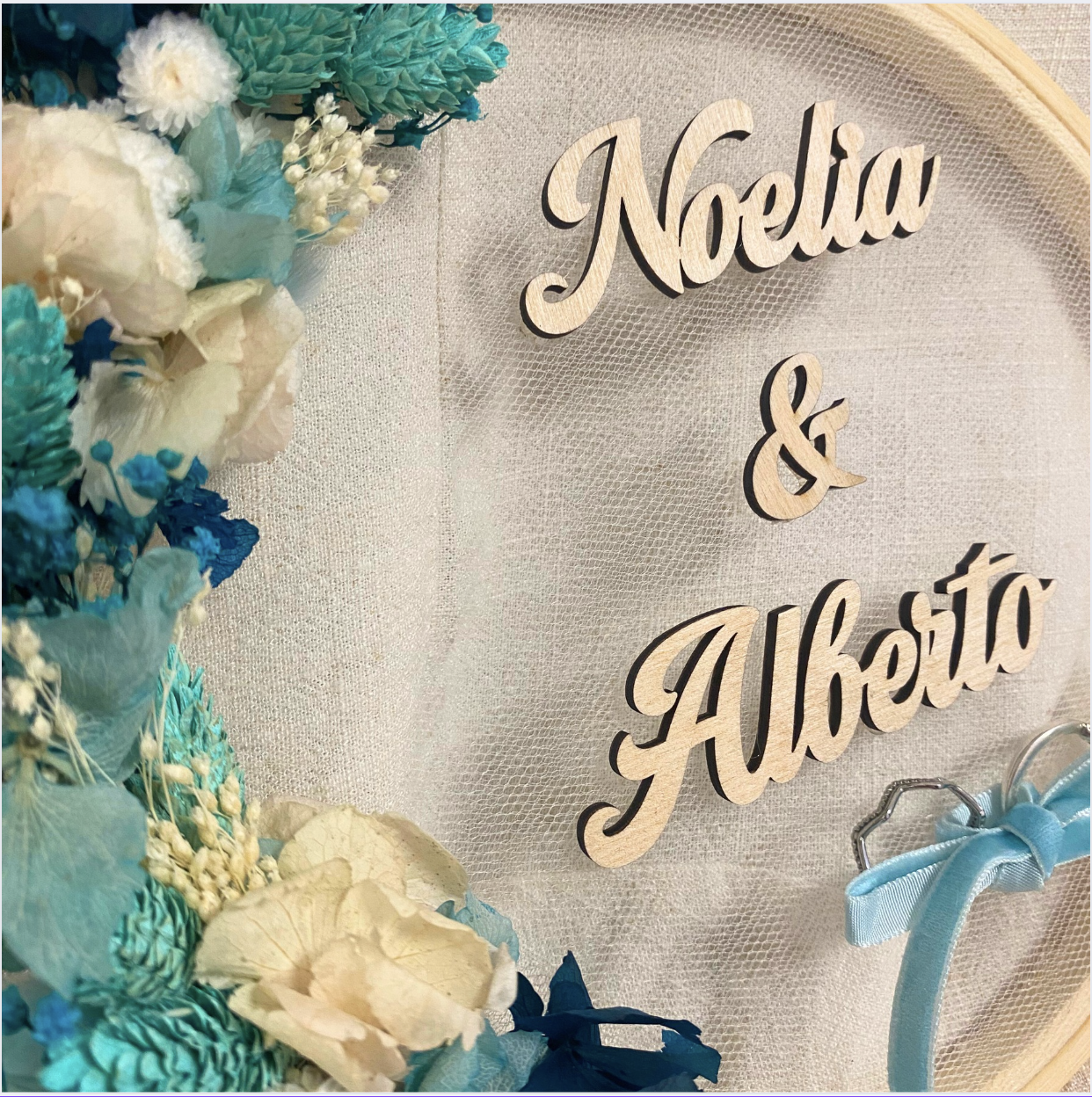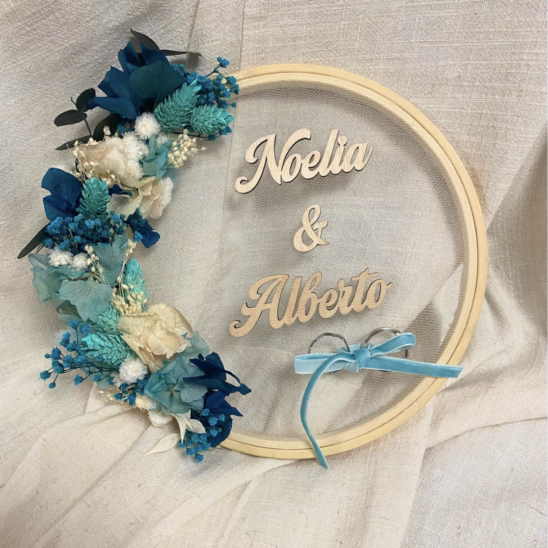 Nuestro porta alianzas artesanal combina la elegancia del bastidor con la belleza eterna de las flores preservadas, creando una pieza única para el momento más especial del gran día.